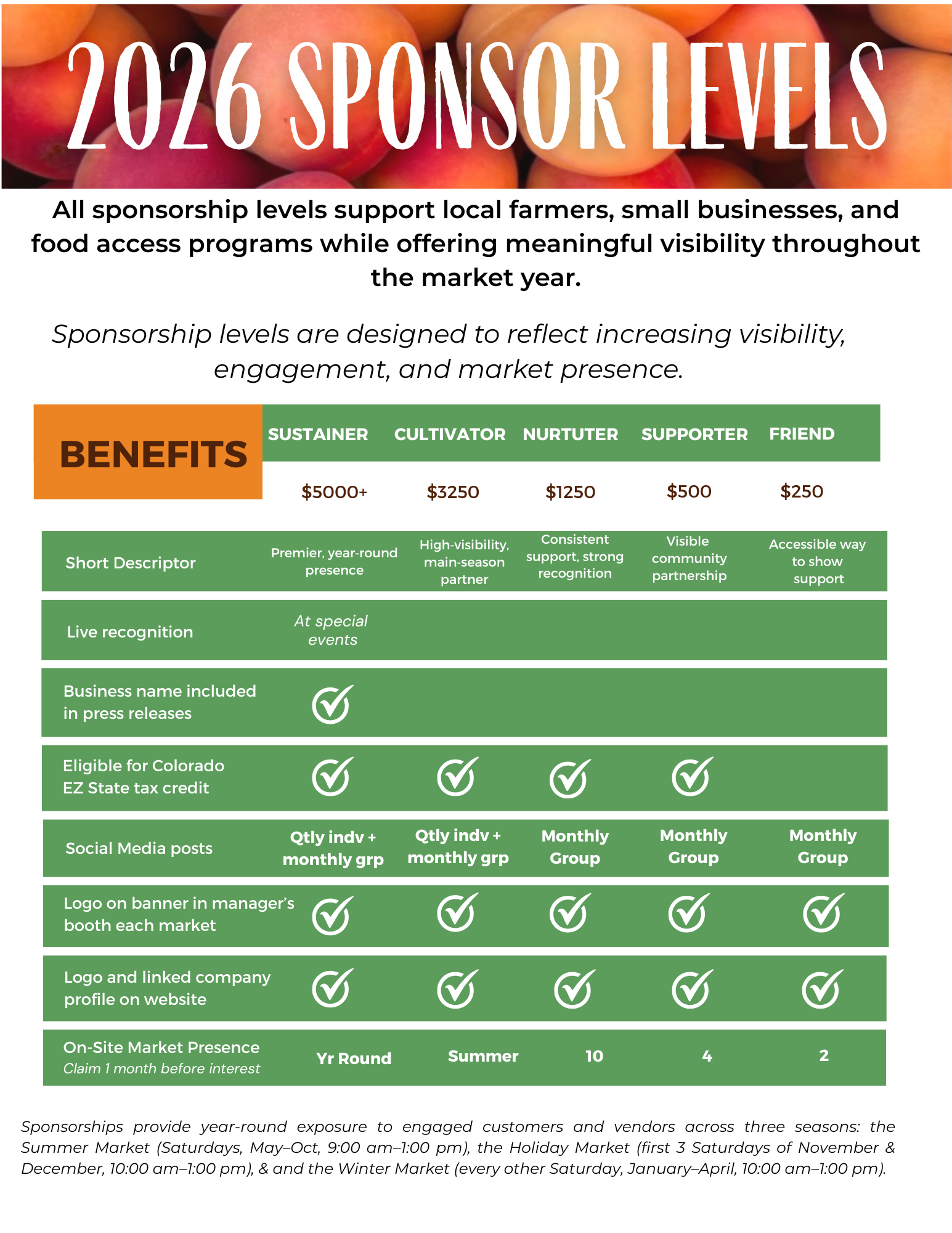 When you become a sponsor of the Montrose Farmers Market, you join a community-wide effort to create and sustain a local food economy, one that protects family farms, safeguards the environment, improves health & nutrition, creates jobs, and puts wholesome, delicious foods on your table.